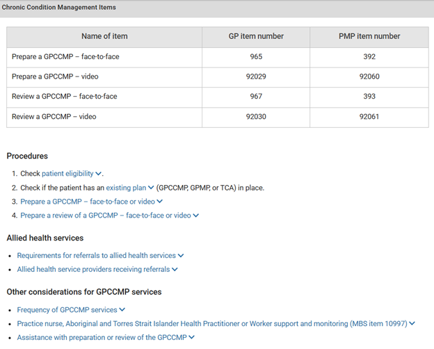Called ‘Chronic Condition Management Items’, the page covers the introduction of the General Practice Chronic Condition Management Plan (GPCCMP), including the relevant new item numbers. It features a streamlined view of the changes and includes direct links to the corresponding MBS Online resources.